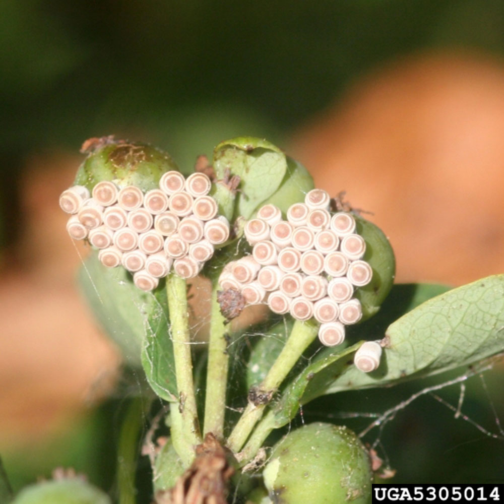 Stink bugs feed on plants with piercing, sucking mouthparts. They damage leaves, flower buds, flowers and fruits. They suck out vital plant juices, leaving brown pits and spots behind. Plants become stunted, fruits and flowers are deformed, leaves wilt and young plants die. Mating stink bugs lay clusters of unique barrel-shaped eggs on lower leaf surfaces.