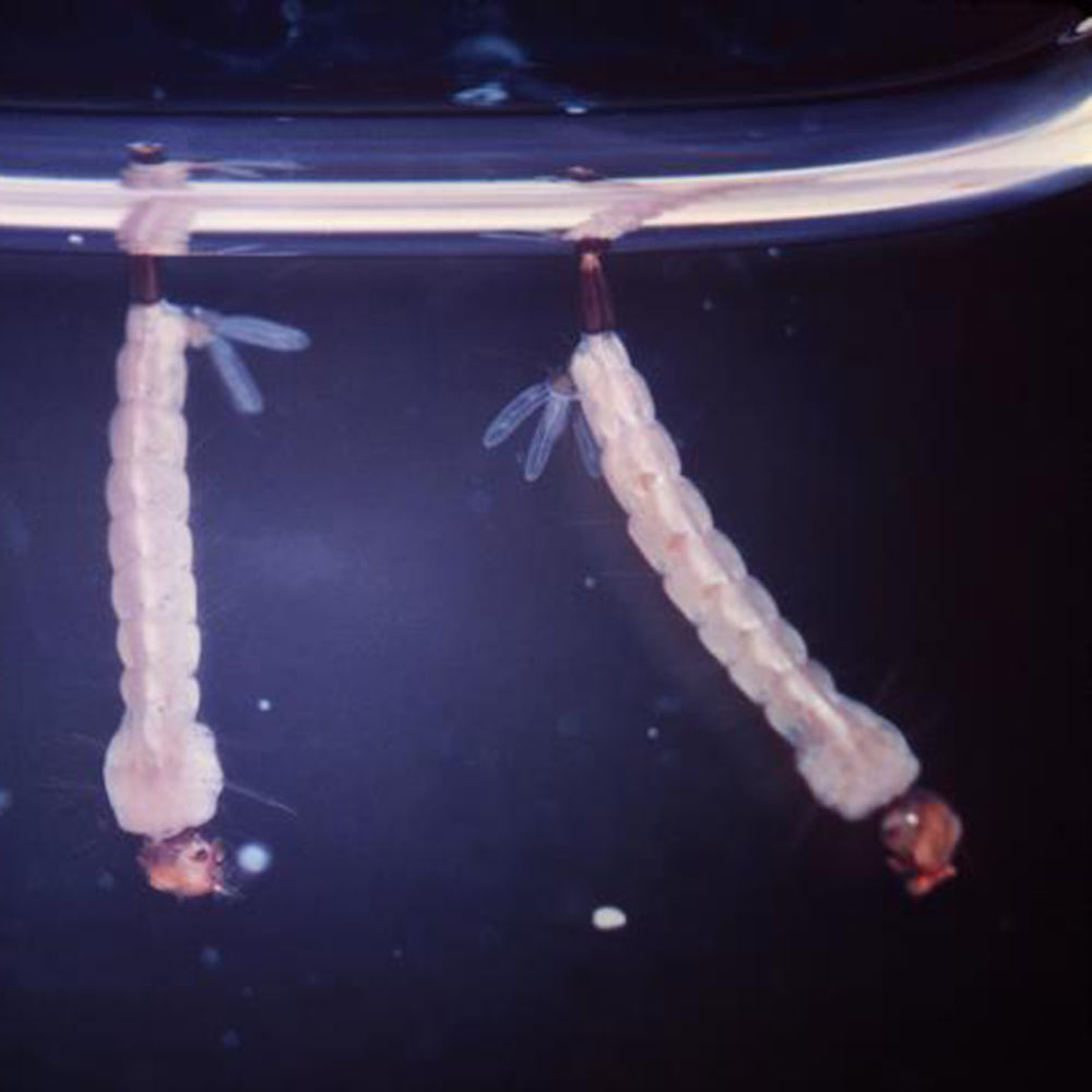 Unlike common brown house mosquitoes, these Aedes mosquitoes have distinctive black and white markings. Adults grow up to 1/4 inch long, with six black and white legs and two veined, transparent wings. Their eggs are white when laid, but quickly turn black. The caterpillar-like larvae hang suspended in water by their rear tips. Unlike black fly larvae, Aedes mosquito larvae don't have bulging posteriors.