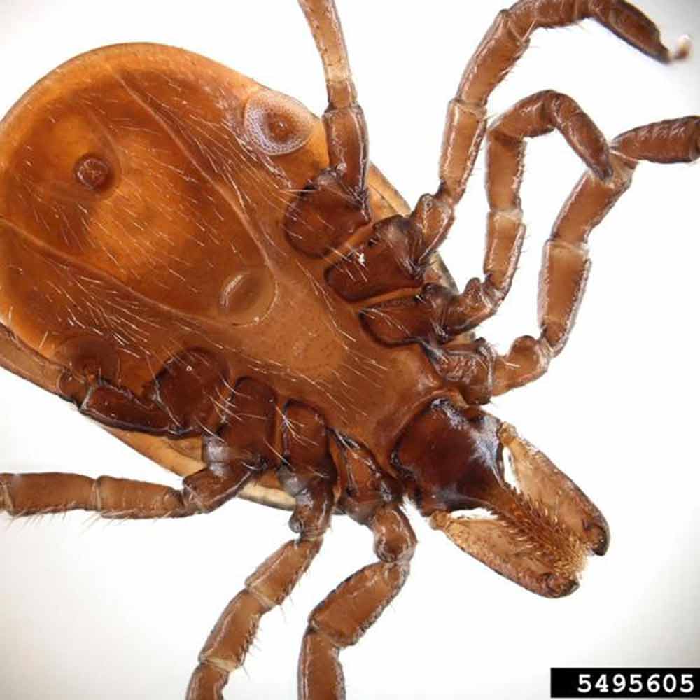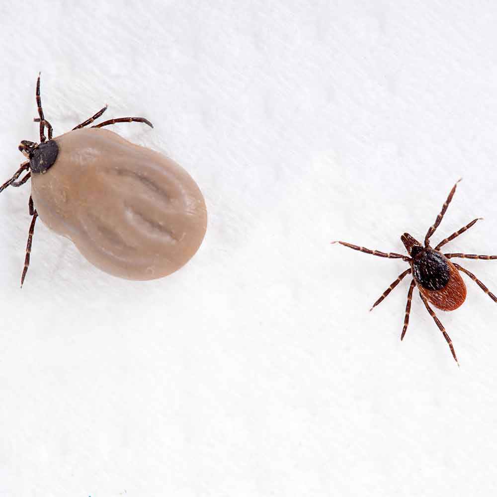 Female deer ticks have orange-red bodies with a dark, brown-black scale right behind their head. Male deer ticks are completely dark brown. The adult female measures roughly 1/8 inch long — about the size of an apple seed — with the male being slightly smaller. After feeding, female deer ticks engorged with blood can balloon up to 1/2 inch in length. Deer tick nymphs grow less than 1/16 inch long. Larvae are smaller still.