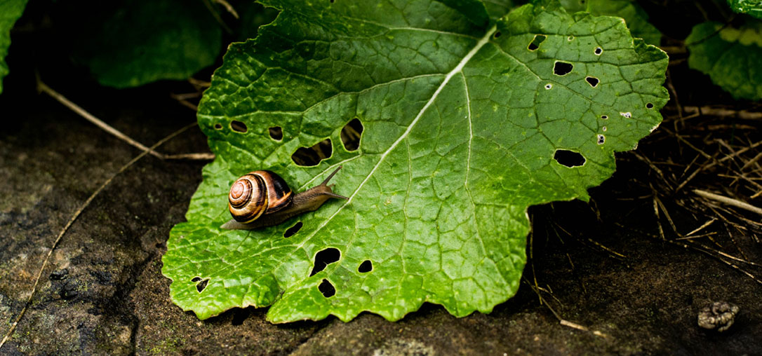 Snails and slugs come out in throngs when moderate temperatures and wet weather combine in spring and fall. In a single night, these pests can turn beautiful foliage plants into masses of tattered greenery. Signs of snail and slug damage include:- Large, irregular holes throughout the leaf surface