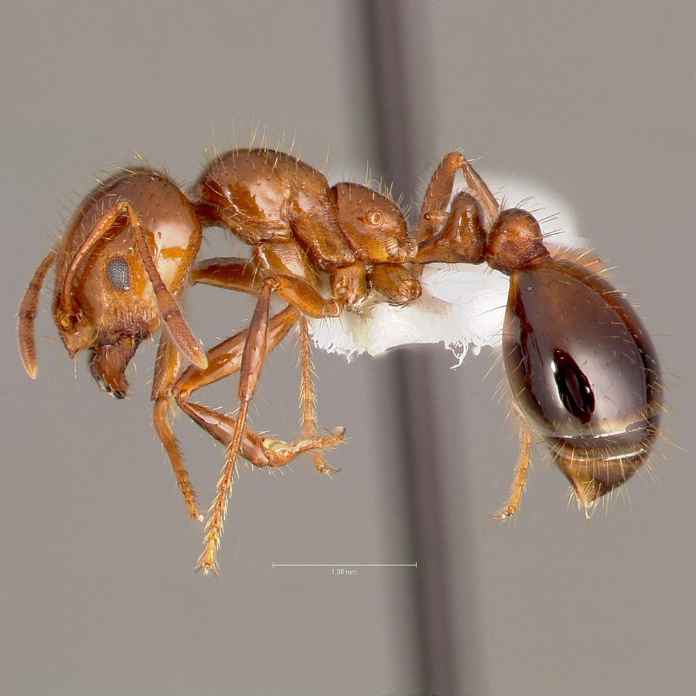 Red imported fire ants have dark reddish brown bodies with two distinct hump-like nodes in the waist area, known as the petiole, right behind the thorax. Their abdomens, often darker brown to nearly black, carry stingers on the end. Seen under magnification, red imported fire ants have three teeth centered at the front of their mouths, behind their mandibles. Common native fire ants have just two.
