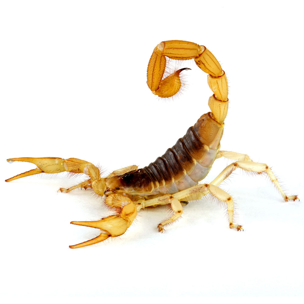 Scorpions have eight legs and two large front pinchers that they use to hold their prey as they sting it. Their long, segmented tails end with a venom-filled stinger. Some scorpions curve their tails high over their backs, but others curve theirs to the side. While most scorpion stings aren't life-threatening for humans, reactions can be painful and severe.