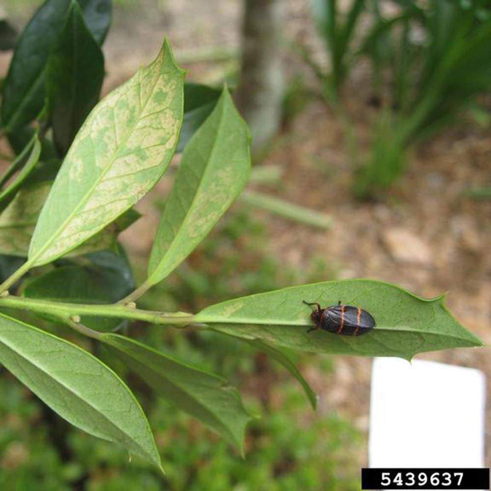 Adult and immature two-lined spittle bugs feed on grasses and other plants. While adults cause the most damage, the cream-colored nymphs attract more attention. As the nymphs feed, they produce a mass of frothy, spittle-like foam that hangs from grass blades. When populations are high, these pests move into other plants, from hollies to strawberries and asters.