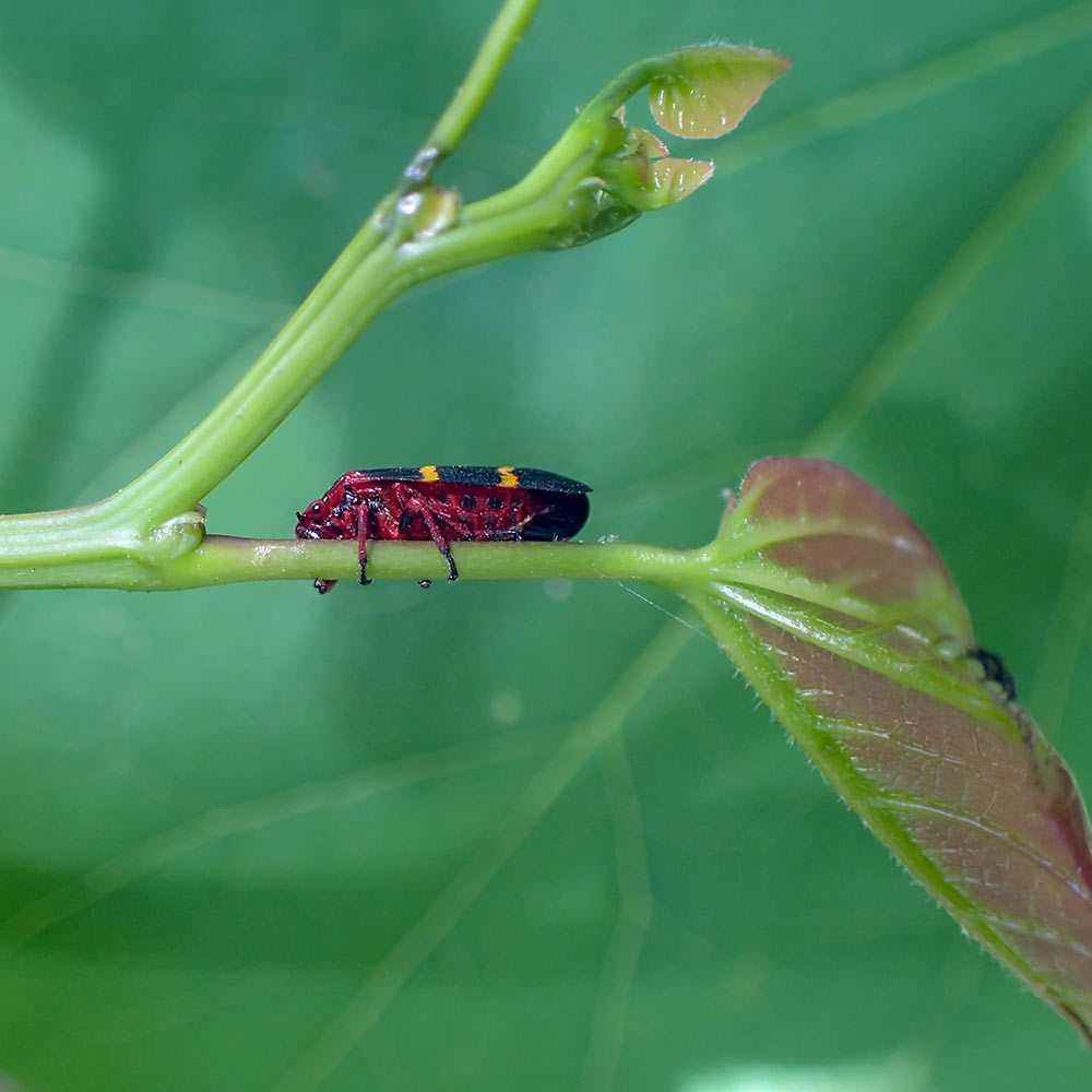 Two-lined spittle bugs are winged pests that damage lawns and other ornamental plants. Also known as froghoppers, adult two-lined spittle bugs grow about 3/8 inch long. As the first part of their name suggests, they have two bright orange lines across their black wings. When in flight, their bright red abdomens show clearly.